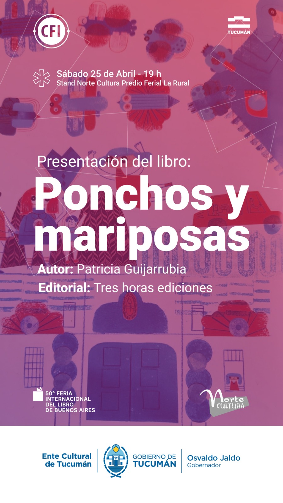 La provincia de Tucumán continuará su agenda en la 50ª Feria Internacional del Libro de Buenos Aires con la presentación de Ponchos y mariposas, de Patricia Guijarrubia, que se realizará el sábado 25 de abril a las 19 h en el stand Norte Cultura (Pabellón Ocre).